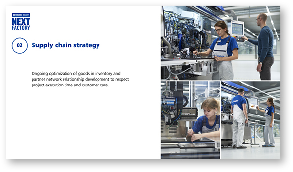 Inox Communication a accompagné Mikron Boudry dans la formulation de la Next Factory, avant même qu'elle ne soit opérationnelle, de la hiérarchisation de ses objectifs stratégiques à la définition de sa vision. Un travail de fond a été effectué sur la formulation des différents messages clefs que délivrera ce nouvel écrin auprès des différentes parties prenantes (acteurs locaux, collaborateurs du groupe, actionnaires et clients). Le résultat : une présentation modulaire, sous forme de keynote animée, des outils de vente et de promotion dont Inox a géré la production des contenus.